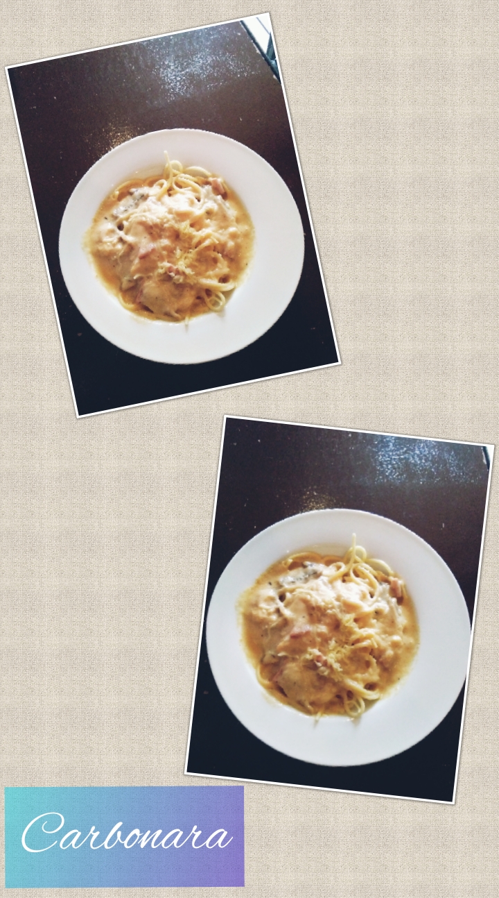 The sauce of the carbonara is made of milk and butter mixed with mushrooms and ham. And it will placed on the top of the noodles.